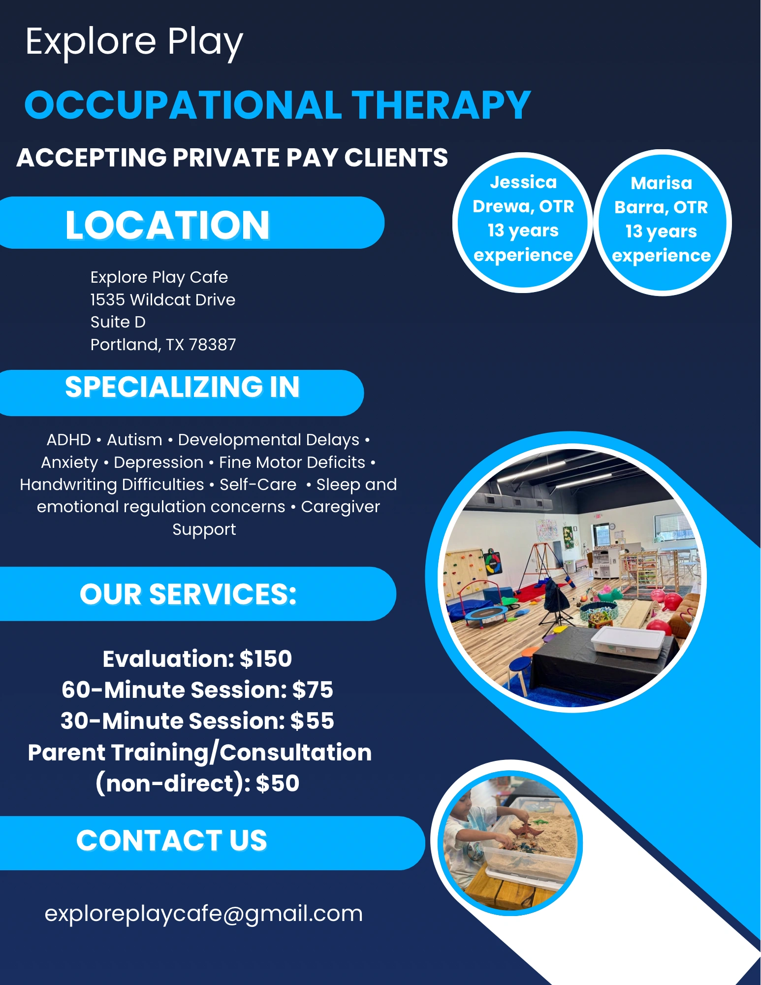 Our experienced and compassionate therapists are dedicated to helping children thrive through play, connection, and skill-building. We offer flexible scheduling, individualized consultations, and the support your family needs. With no wait list and a welcoming environment, we make it simple to get started and see meaningful progress.